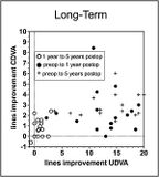 In einer anderen Darstellung der Langzeitergebnisse, wo die individuelle Verbesserung der Sehschärfe nach dem Eingriff dargestellt ist, kann man die Langzeitstabilität sogar noch besser erkennen. Man sieht in der nebenstehenden Grafik deutlich, dass es einen Stopp des Fortschreitens der Erkrankung gibt, ja sogar eine weitere kontinuierliche Verbesserung von Jahr zu Jahr nach der Behandlung im Sinne einer "Antiprogression". So kann man durchaus von einer Therapie sprechen kann, die zu einer "Heilung" der Erkrankung führt. Die weißen Punkte zeigen die Verbesserung der Sehschärfe zwischen dem 1. Jahr nach dem Eingriff und dem 5. Jahr nach dem Eingriff. Auf der horizontalen Achse ist die Verbesserung der unkorrigierten Sehschärfe dargestellt und auf der vertikalen Achse die Verbesserung der korrigierten Sehschärfe. Kein Auge zeigte eine signifikante Verschlechterung und die meisten Augen zeigten eine signifikante Verbesserung der Sehschärfe in dieser Zeit. Selbst vom 1. bis zum 5. Jahr nach der Behandlung zeigte sich vielfach noch eine statistisch signifikante Verbesserung der Sehschärfe (Prangl-Grötzl A, Ettl A, Hörantner R, Daxer A. Individual Long-term Visual Stability after MyoRing Treatment of Keratoconus. International Journal of Keratoconus and Ectatic Corneal Diseases 2016;5:53-56, Daxer A, Ettl A, Hörantner R. Long-term results of MyoRing treatment of keratoconus. Journal of Optometry 2017;10:123-129). Die retrospektive Analyse von über 1000 Behandlungen mit einer Nachbeobachtungszeit von bis zu 10 Jahren zeigt eine Erfolgsrate von 95% in Bezug auf die dauerhafte Verbesserung der Sehschärfe.